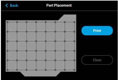 By default this setting is set to On, meaning you will be able to select a job’s location on the substrate prior to starting the build (see “Selecting a Job to Build” (page 16)). At the start of a build the Part Placement dialog will be displayed asking you to select the part’s build location (see Figure 21 (page 26)). The dialog will contain a graphic representing your printer’s platen as well as a blue bounding box graphic (the imaginary box surrounding the part). You can select the part’s build location by dragging and dropping the bounding box on the touchscreen; the bounding box cannot be placed outside the limits of the platen. Pressing the Print button will confirm your selected placement and start a build.