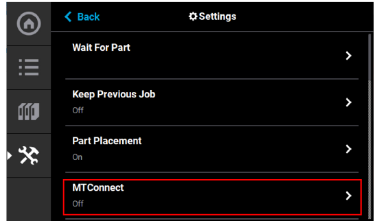 3.On the Settings screen, scroll down to tthe MTConnect setting. Select MTConnect.