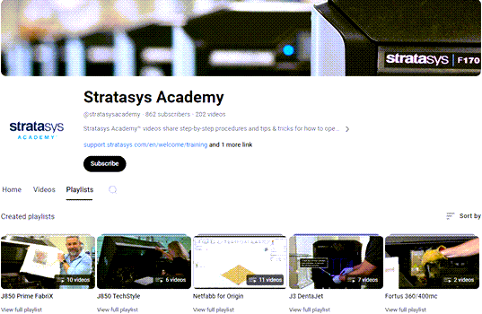 The Stratasys Academy YouTube Channel features instructional videos about how to operate and maintain Stratasys printers. The channel includes dedicated playlists for different printers and special topics like post-processing.