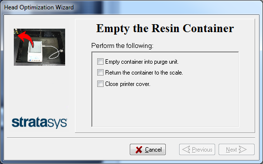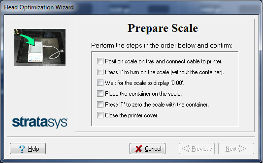 During this procedure, you place a scale on the build tray and connect it to the printer. Printing material (resin) is jetted from each head and its weight is automatically recorded and the wizard determines how to optimize the print heads.