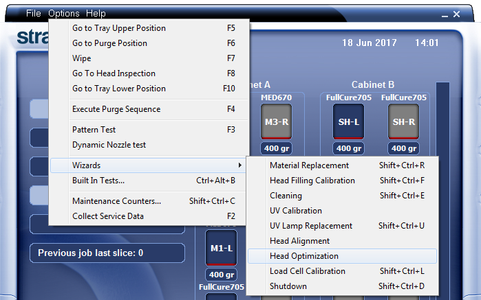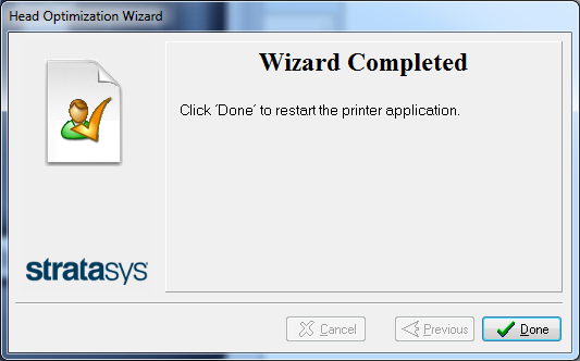 If, during the optimization process, the wizard determines that a print head is faulty—or that it is negatively affecting layer uniformity with the current head configuration—the wizard instructs you to replace it. If this happens, you can continue the wizard to replace the print head, or abort the wizard, to replace the head at another time.