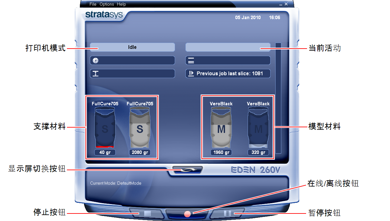 您可从 Objet StudioJob Manager 界面停止 并稍后恢复打印单击打印机界面上的 Stop(停止)按钮之后,您只能从 Job Manager(作业管理器)界面恢复打印。然而,在单击打印机界面中的 Pause(暂停)按钮之后,仅可从打印机界面恢复打印。