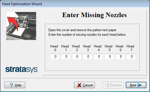 在 Missing Nozzles(缺失喷嘴)屏幕中,输入每个打印头的缺失喷头的数量,然后单击 Next(下一步)。 |