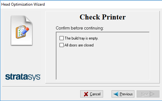 请检查成型托盘为空且打印机机盖已关闭。在向导屏幕中对此进行确认并单击 Next(下一步)。 |