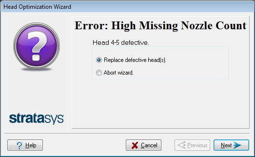 如果在优化过程中,向导确定打印头出现故障(或在当前打印头配置下会对层均匀性产生负面影响),则向导会指示您更换它。如果发生这种情况,则可以继续执行向导来更换打印头或中止向导,以便在其他时间更换打印头。