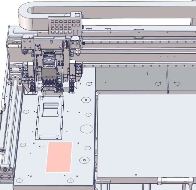 当“Preparation for Pattern Test(准备图样测试)” 屏幕出现时,打开打印机,将粉红色的纸粘在成型托盘表面的左侧,如下图所示。 |