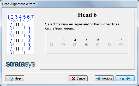单击 Next(下一步)显示下一个打印头对齐屏幕,并再次选择该打印头透明玻片上代表对齐最接近的垂直线的数值。 |