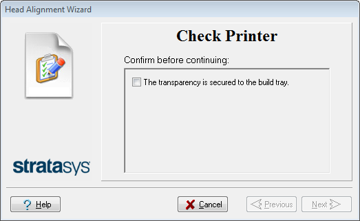 在向导屏幕,选中复选框以确认透明纸已经固定到成型托盘,并单击 Next(下一步)。 |
