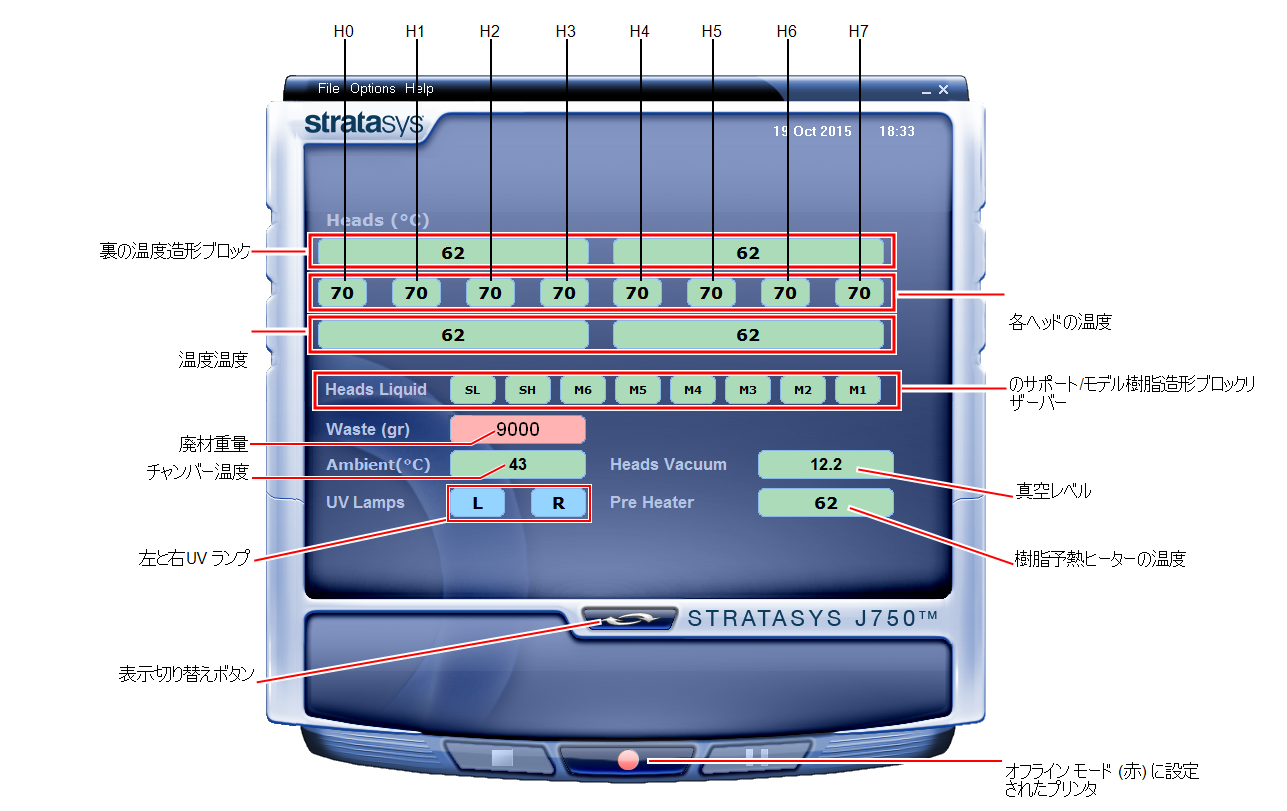 | 3。 | プリンタインターフェイスに示されているように、十分なモデル樹脂とサポート樹脂がロードされていることを確認してくださいを参照)。 |