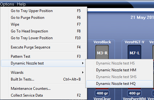 3D 조형물의 열악한 품질이 (패턴 테스트에서 나타나지 않은 경우라도) 프린터 헤드의 노즐 막힘이나 고장으로 인한 것이라고 의심되면 Dynamic Nozzle Test를 실시합니다.