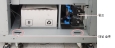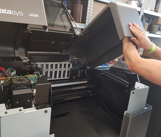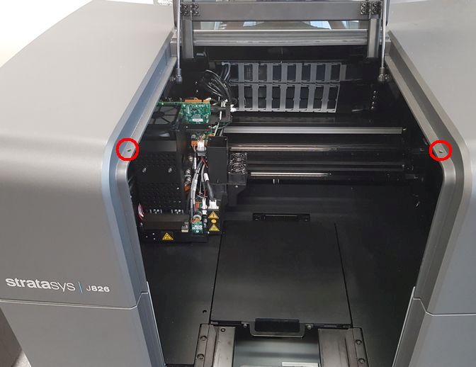 전체 프린터 상단을 들어 올리고 재료 캐비닛을 이동하여 오른쪽 프린터 패널에 액세스합니다(프린터를 향한 상태에서). |