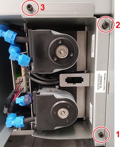 표시된 순서대로 펌프 하우징을 고정하고 있는 나사를 제거합니다. |