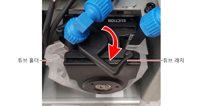 아래 그림과 같이 펌프의 튜브 래치를 풉니다. |