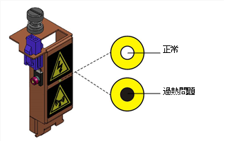 紫外線燈罩上貼有熱敏感標籤,以警告需提防過熱。如果燈罩上的溫度達到 65°C (150°F),標籤的中間會從白色變為黑色。如果發生此問題,請勿使用印表機,並聯絡您的服務供應商。為了預防起見,建議您在列印前後都要檢查標籤。
