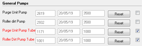 Maintenance Counters (유지 관리 카운터) 화면을 열고 General Pumps (일반 펌프) 섹션으로 이동한 다음 관련 카운터에 대해 Reset. |