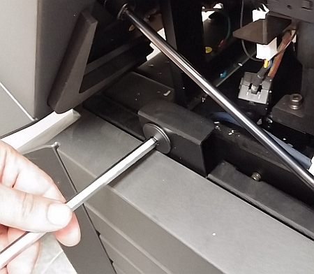 8mm 육각(알렌) 렌치를 사용하여 (사용자가 프린터를 마주볼 때) 왼쪽 프린터 패널을 고정하고 있는 두 래치를 엽니다. |