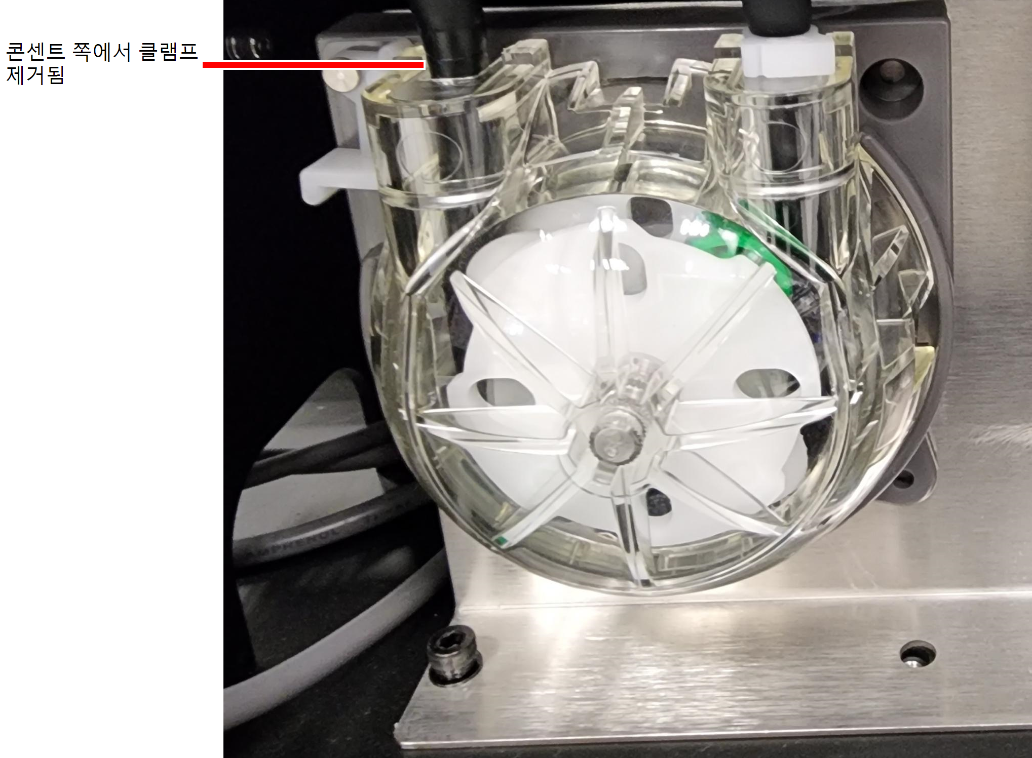 폐기물 용기(펌프 배출구)로 향하는 튜브에서 클램프를 제거합니다. |