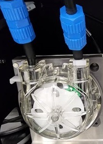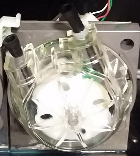 펌프 양쪽에 있는 튜브가 분리되면 펌프 "카세트"를 시계 반대 방향으로 돌리고 제거합니다. |
