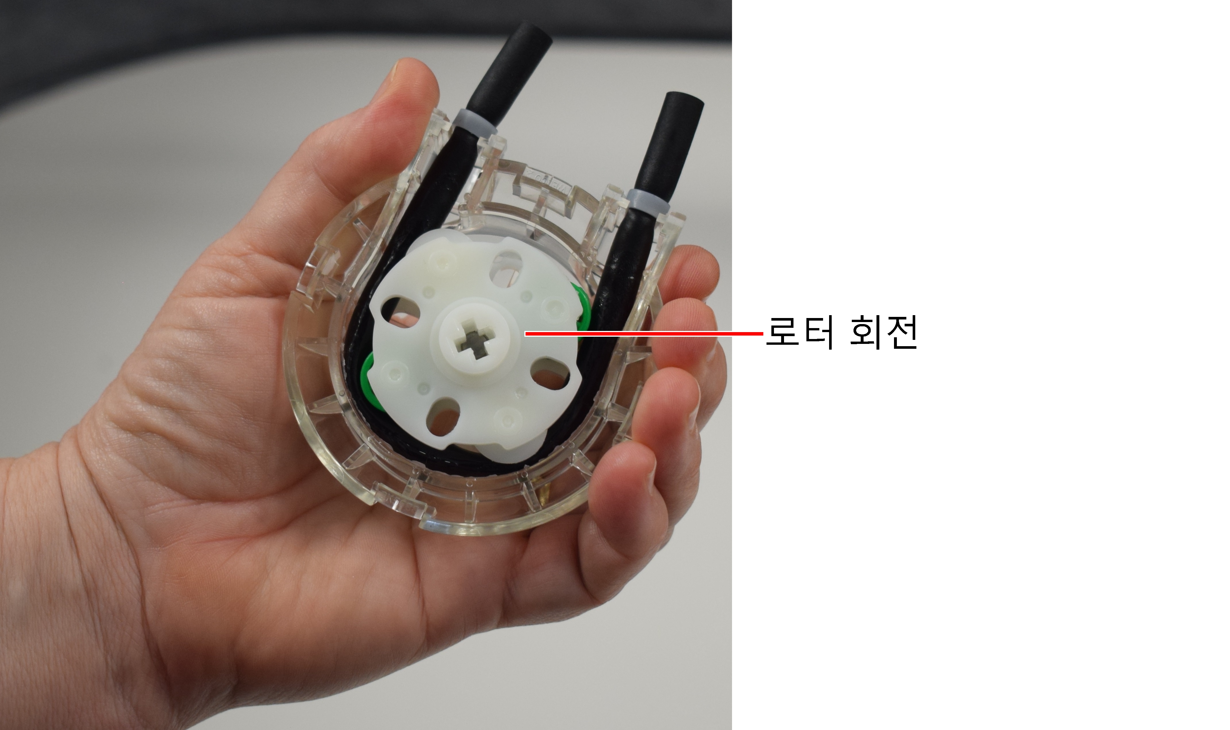한 손으로 새 펌프 카세트를 잡고 로터를 돌립니다. |