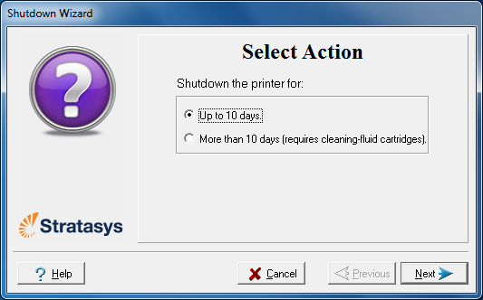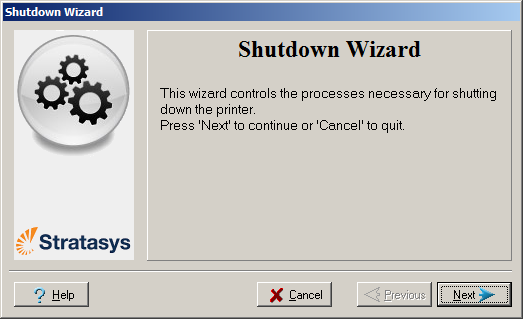 종료 프로세스는 프린터 구성 요소에서 조형 재료를 플러싱합니다. 중요한 재료가 플러싱되지 않게 방지하려면 일주일에 한 번 이상 모델을 조형하십시오. 많은 프린터 운영자들이 이 기회를 이용하여 고객 샘플이나 테스트 모델을 조형합니다.