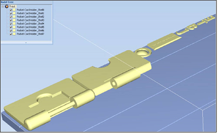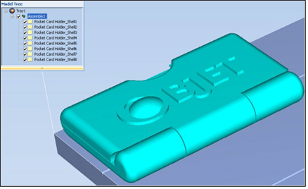 您可一次打开多个 stl 文件 ,将多个模型置于成型托盘上。如果您选择的多个 stl 文件可组成一个组件,您就可以选中全部或部分零件。若要打印整个模型,选择组件的所有 stl 分卷文件,并选中 Assembly(组件)复选框。这样放置的零件是完整、统一的模型,而不是作为独立零件放置。以下图中显示了选中 Assembly(组件)复选框(在模型树和成型托盘显示中)的效果。