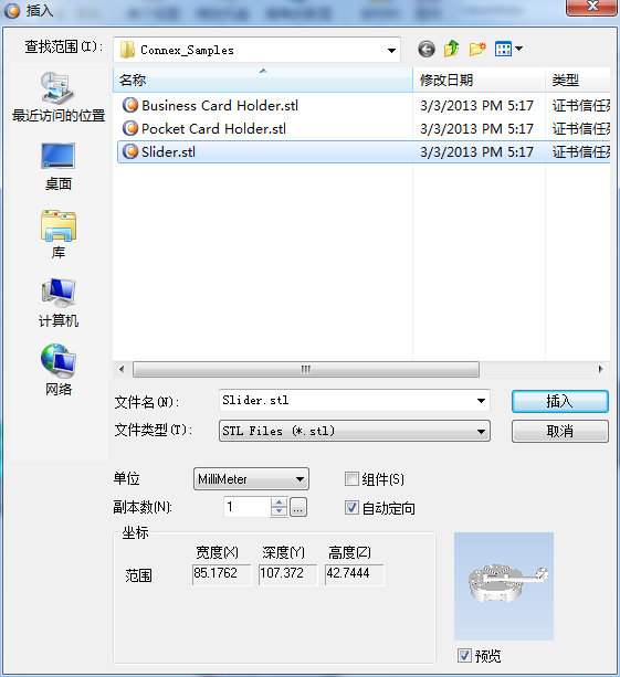 Assembly(组件)复选框被选中—stl 文件作为 组件放置