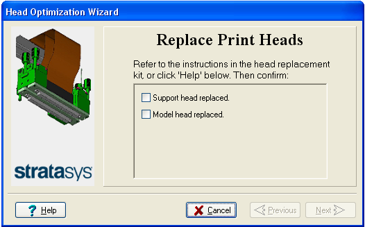 | 6。 | [Replace print heads (造形ヘッド交換)] 画面 で、チェック ボックスを選択して、ヘッドを交換したことを確認し、[] をクリックします。 |
