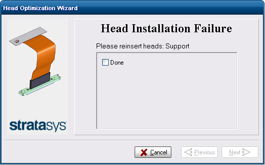 | • | 取り付けた造形ヘッドが新しくない (プリンタから取り外されたことがある) 場合、次のメッセージが表示されます。 |