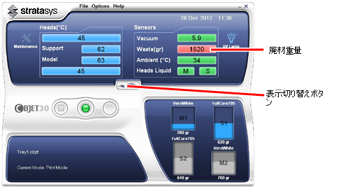 注: 廃棄コンテナ カバーなしでプリンタを操作すると、廃材重量の測定が不正確になります。これによって、プリンタに廃棄物が過剰に流れ込むことになります。