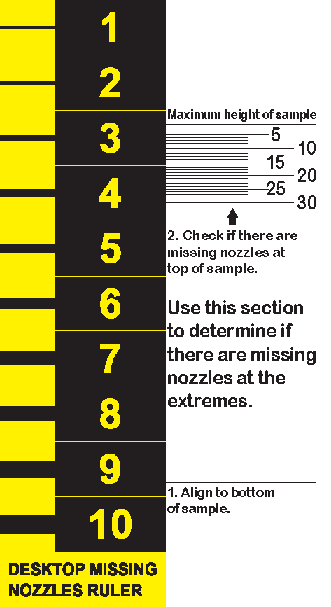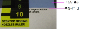 c. Missing Nozzles(누락 노즐) 측정자의 선과 샘플의 공백에 맞춰 조형된 샘플에 공백이 있는지 확인합니다. 선 옆의 측정자의 숫자는 누락 행/노즐 수를 나타냅니다.