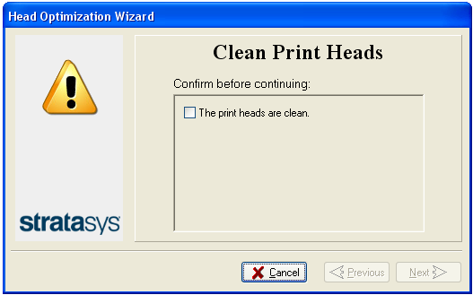 조형 300 시간마다 또는 프린트 헤드 상태가 조형된 모델 품질에 부정적인 영향을 미칠 때마다 또는 프린트 헤드 하나 이상에 문제가 있는 것으로 의심되는 경우 Head Optimization(헤드 최적화) 마법사를 실행하십시오.