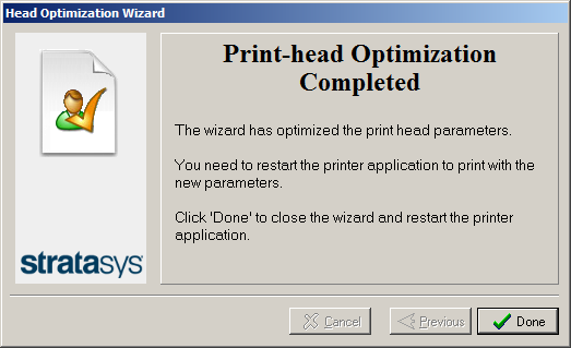 하지만 프린트 헤드를 교체한 후 최적화한 후 Head Alignment(헤드 정렬) 마법사를 실행하여 계속 진행할 수 있는 다른 화면이 나타납니다(32페이지 참조). 프린트 헤드를 교체한 후 모델을 조형하기 전에 필요합니다. 지금 헤드를 정렬하도록 선택하지 않는 경우 프린터 애플리케이션이 닫히고 Done(완료)을 클릭하면 다시 열립니다. |
