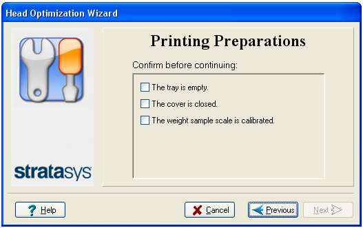 프린트 헤드의 상태는 조형된 모델의 품질에 직접적인 영향을 미칩니다. 최적의 조형을 유지 관리하려면 프린트 헤드를 테스트하고 Head Optimization(헤드 최적화) 마법사를 실행하여 가능한 최상의 작업 구성으로 프린트 헤드를 보정하십시오. 이 절차는 완료하는 데 1시간 정도 걸립니다.