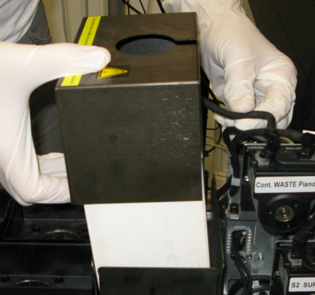 폐기물 격실에 청소용 천을 깔아서 유출되는 재료를 흡수시킵니다. |