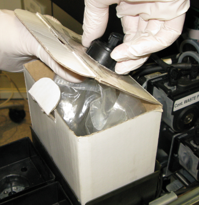 컨테이너에 폐기물 튜브를 연결하는 캡을 풉니다. |