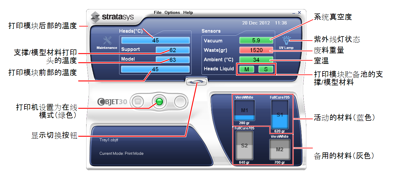 | 2. | 请确保装载了充足的模型材料和支撑材料,如打印机界面所示。 |