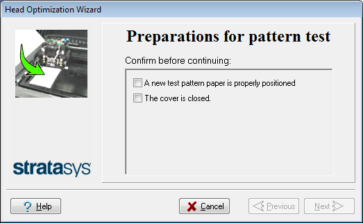 Falls der Assistent während des Optimierungsvorgangs feststellt, dass ein Druckkopf fehlerhaft ist oder dass er die Einheitlichkeit der Schichten mit der aktuellen Kopfkonfiguration negativ beeinflusst, wird eine Anweisung zum Austauschen vom Assistenten ausgegeben. In diesem Fall können Sie mit dem Assistenten fortfahren (um den Druckkopf auszutauschen) oder den Assistenten abbrechen (um den Kopf zu einem späteren Zeitpunkt auszutauschen).