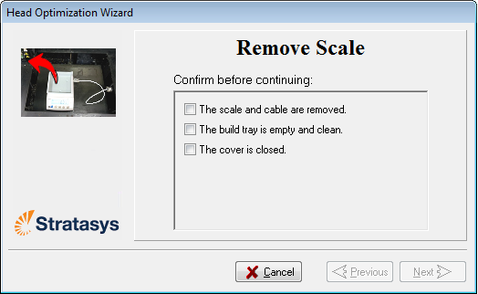 Während dieses Verfahrens setzen Sie eine Waage auf die Bauplattform und schließen sie an den Drucker an. Das Druckmaterial (Harz) wird von jedem Druckkopf ausgegeben und das dazugehörige Gewicht wird automatisch erfasst. Der Assistent bestimmt, wie die Druckköpfe optimiert werden.