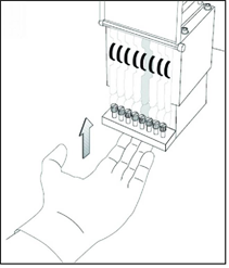 Schieben Sie den Austauschkopf vorsichtig in den freien Steckplatz im Druckblock, und drücken Sie die Treiberkarte des Druckkopfes in ihren Stecksockel. |
