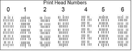 Auf die Transparentfolie werden Gruppen vertikaler Linien in sieben Spalten gedruckt, die jeweils die Ergebnisse eines anderen Druckkopfes darstellen.