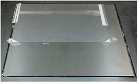 Wenn Sie aufgefordert werden, legen Sie die transparenten Folien auf die Bauplattform neben den linken und rechten Plattformrand, wie in der folgenden Abbildung dargestellt. |