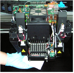 Durch regelmäßiges Überprüfen und Reinigen der Düsenplatten unten am Druckblock ist zu gewährleisten, dass die Druckerdüsen nicht verstopfen. Ein Assistent führt Sie durch diesen Vorgang und passt die Komponenten des Druckers für die Reinigung an. Die Prozedur dauert ungefähr 20 Minuten und sollte zu Beginn des Arbeitstages bzw. vor größeren Druckjobs ausgeführt werden.