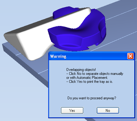 Objet Studio 检查托盘上的对象定位是否有问题。如果有问题,受影响的对象将显示出特殊的颜色(请参看托盘验证)并出现警告消息。