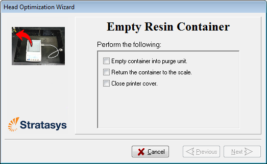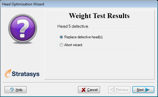 如果在优化过程中,向导确定打印头出现故障(或在当前打印头配置下会对层均匀性产生负面影响),则向导会指示您更换它。如果发生这种情况,则可以继续执行向导来更换打印头或中止向导,以便在其他时间更换打印头。