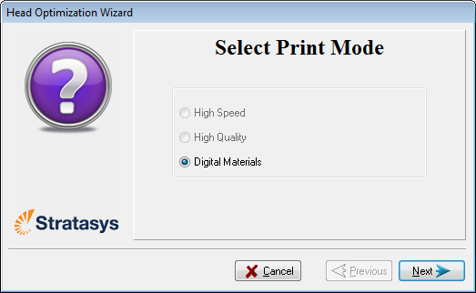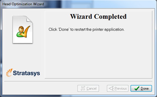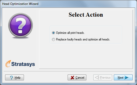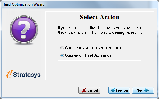 如果在優化過程中,精靈確定有列印頭出現故障—或在當前列印頭組態下會對層均勻性產生負面影響—則精靈會指示您更換列印頭。如果是這樣,您可以繼續精靈以更換列印頭,或是取消精靈並下次再更換列印頭。