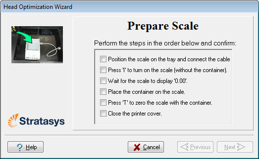 在此步驟中,您需在成型托盤上放一個秤,並將其連接到印表機上。列印材料(樹脂)會從每個列印頭噴射出來,而且其重量會自動記錄下來,讓精靈能決定如何為列印頭進行優化。