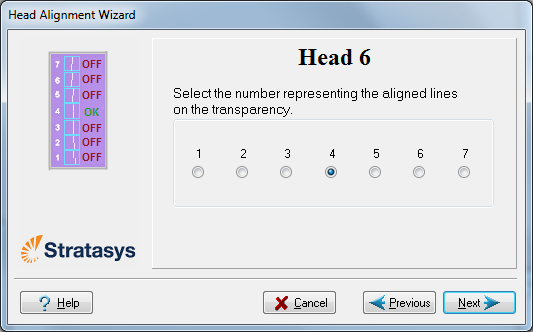 按一下 Next(下一步) 以顯示下一個列印頭對齊的畫面,並再次為該列印頭選擇在透明紙上,代表了最佳對齊的垂直線的數字。. |