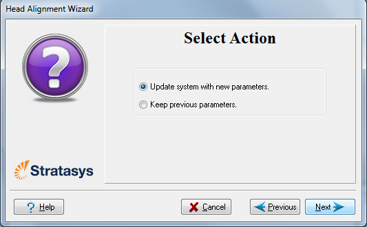 要讓對齊變更在印表機內生效,請確認已選擇了 Update system with new parameters(以新參數更新系統),並按 Next(下一步)。 |