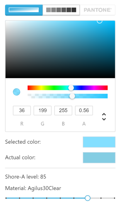 Tango+ 또는 Agilus30이 로드된 재료인 경우 색상 선택기 외에도 Shore-A 슬라이더를 사용하여 믹스에 사용되는 유연한 재료의 양을 결정할 수 있습니다. 쇼어-A 레벨이 낮을수록 더 많은 재료가 사용되어 더 부드러운 재료가 됩니다.
